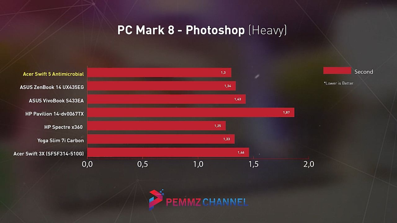 Kami cuma bisa bilang “GILA!!!”, Karena performa CPU pada notebook ini mampu mengalahkan semua render time Core i7-1165G7 yang pernah kami uji di pengujian PCMark 8 Adobe Photoshop Heavy dan Adobe After Effects CC.
