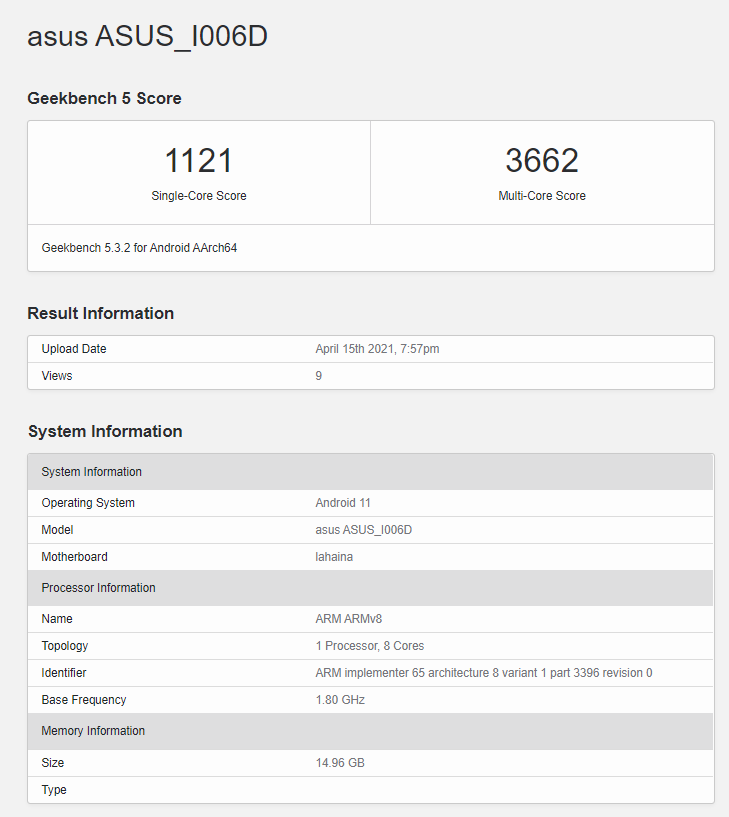 Pembocor Twitter @Stufflistings menemukan ZenFone 8 Mini online. Skor single-core 1.121 dan skor multi-core 3.662 sejalan dengan smartphone bertenaga Snapdragon 888 lainnya. Sementara skor multi-core bisa sedikit lebih tinggi, kami dapat menghubungkannya dengan ZenFone 8 Mini yang menjalankan perangkat lunak pra-produksi.