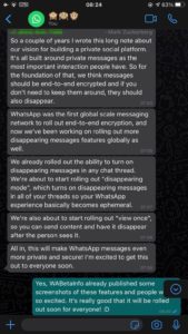 Adalah WABetaInfo yang mempublikasikan percakapan ini. Dalam percakapan tersebut, keduanya sedang membicarakan soal tiga fitur baru yang akan dapat digunakan oleh para pengguna aplikasi tersebut.