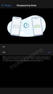 Untuk fitur “Disappearing Mode”, seperti namanya, pengguna akan dapat membuat pesan mereka menghilang dalam jangka waktu tertentu. Jadi, apakah penerima sudah membaca atau belum pesan yang diterimanya akan tetap terhapus dalam jangka waktu yang ditentukan.