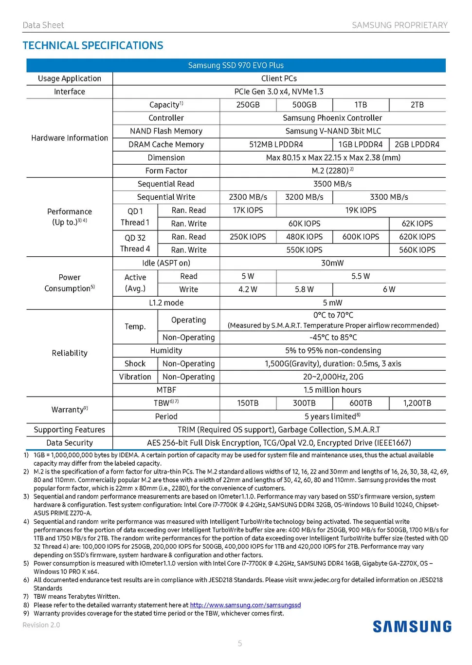 Sementara tabel spesifikasi asli dengan bangga menyebutkan pengontrol Phoenix SSD, versi yang direvisi secara tidak jelas menentukan pengontrol “in-house”. Lembar data sebelumnya mendefinisikan kinerja penulisan berurutan dan acak ketika ukuran buffer TurboWrite terlampaui pada catatan kaki nomor 4.