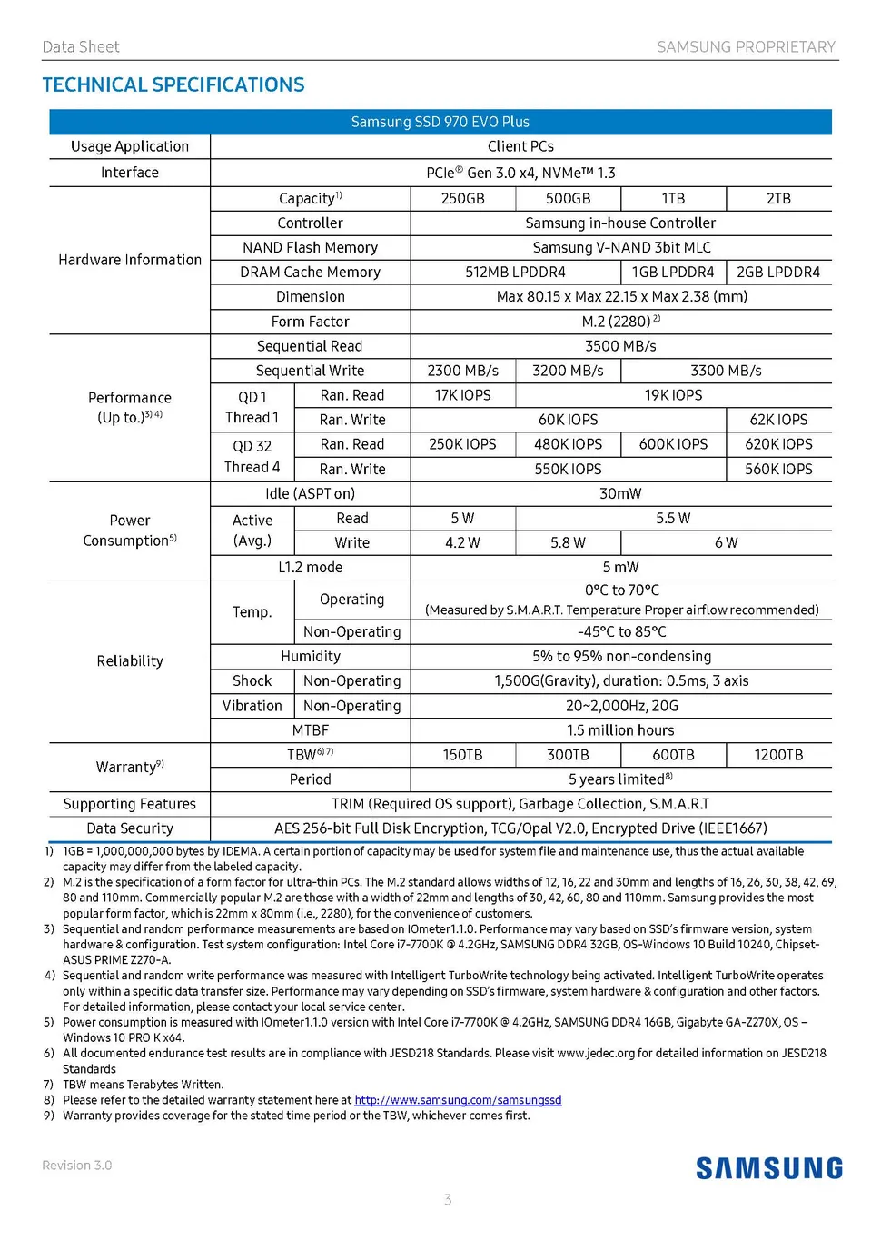 Samsung menghapus nilai pada lembar data baru, yang dapat mengirimkan sinyal yang salah kepada konsumen. Pada tingkat perangkat keras, 970 Evo Plus asli menggunakan pengontrol Phoenix Samsung (S4LR020) dan 92-layer 3D TLC NAND flash dengan pengenal K9DUGY8J5B-DCK0.