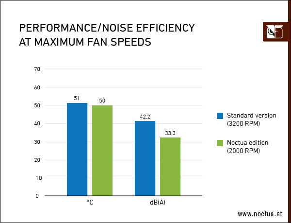 Noctua juga menyediakan beberapa nomor kinerja pendinginan kartu, diukur berdampingan dengan kipas standar dan teknologi pendinginan Noctua sendiri. Hasilnya dapat dilihat di bawah ini: