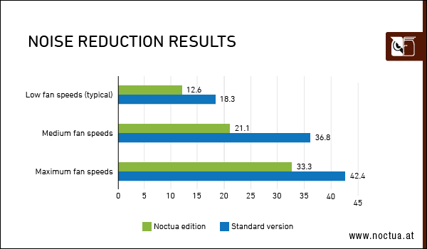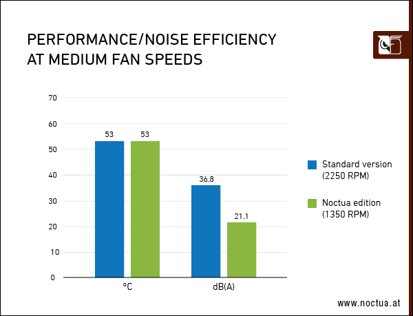 Noctua juga menyediakan beberapa nomor kinerja pendinginan kartu, diukur berdampingan dengan kipas standar dan teknologi pendinginan Noctua sendiri. Hasilnya dapat dilihat di bawah ini: