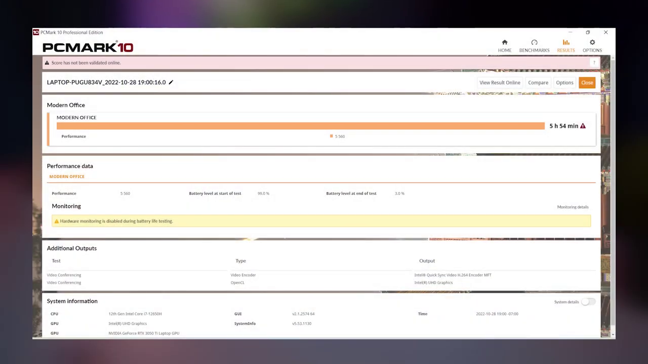 Untuk baterainya, sayangnya laptop ini hanya dibekali baterai berkapasitas 45 WHrs ajah, yang sanggup bertahan sampai 5 jam 54 menit, saat diuji menggunakan PC Mark 10 Modern Office dengan konfigurasi wifi on, dan mode best power efficiency.