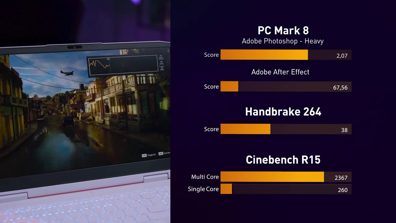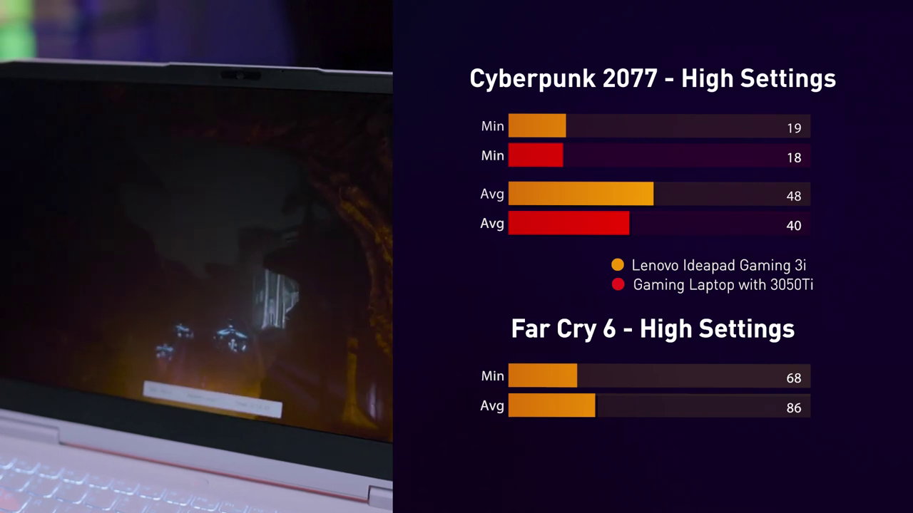 Game-game semacam Cyberpunk 2077 dan Far Cry 6 di settingan High 1080P sanggup menembus diatas 45 FPS. Nah setelah kami analisa, perbedaan performa ini terjadi, utamanya akibat dinaikkannya power limit RTX 3050Ti di laptop ini ke 85 Watt. Worth it lah menurut kami kenaikan yang dikasih ini.