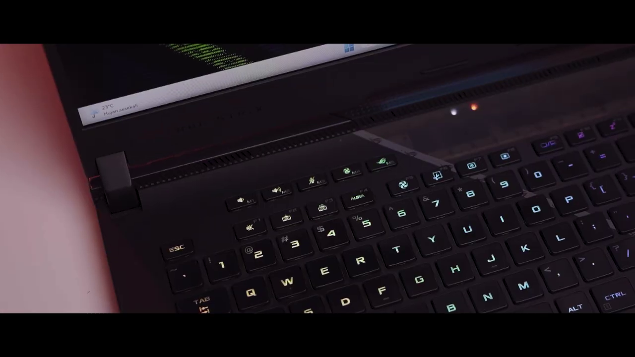 Aura RGB terpancar dari bagian bawah laptop sampe ujung ke ujung key keyboardnya, selain itu terdapat juga gimmick lain kayak ROG Keystone yang jujur kami sendiri gak pernah pake fitur ini serta pada bagian engsel yang terlihat bisa di custom bagian kirinya.