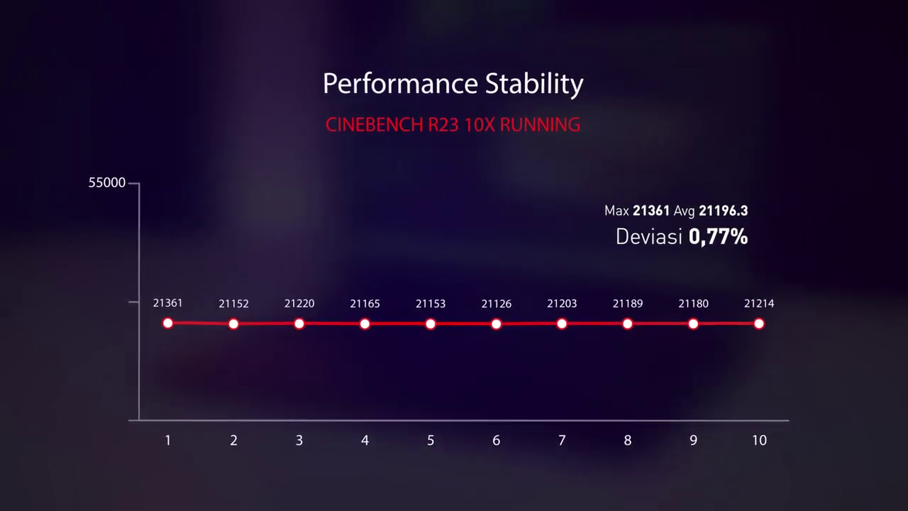 Terlihat saat full load CPU, laptop ini bisa menarik daya maksimal sampai kisaran 220an Watt. Untuk skornya, laptop ini meraih skor maksimal di 21361 poin dengan deviasi hanya 0.77% ajah. Super stabil banget cuy, gak sampe 1%.