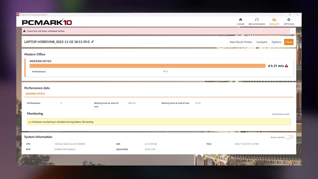 Sementara untuk urusan baterai, laptop ini dibekali baterai berkapasitas 90Whrs yang hanya sanggup bertahan hingga 4 jam 21 menit saja dengan pengujian PC Mark 10 modern office dengan konfigurasi best power efficient, wifi on, dan brightness 50%.