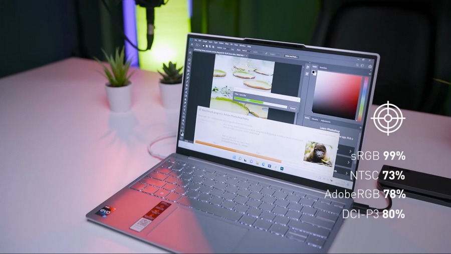 Layar jadi bagian yang cukup ditonjolkan disini. Punya ukuran 13,3 inci, seluruh bezelnya dibuat tipis-tipis. Jadi berasa kayak layar ukuran 14 atau 15 inci. Gak cuma itu, spesifikasnya cukup asik. Resolusinya 2,5K atau sampai 2560×1600. Udah gitu panel IPS-nya punya luas color gamut di 100% sRGB. Tapi pas kami kalibrasi pake Spyder sih kedeteknya 99%. tapi beda dikit gak jadi masalah besar. Sementara NTSC-nya 73%, Adobe RGB 78%, & DCI-P3 80%. Jadi mau dipake desain, gaming, atau apapun, udah enak banget layarnya.
