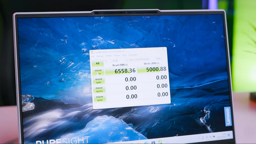 Lenovo cuma kasih satu slot SSD NVMe yang pake bandwith kencang yaitu PCIe 4.0×4. Karena cuma satu makanya kapasitas yang dipakai cukup besar yaitu 1 TB. Kecepatan baca SSD-nya cukup bagus sampai diangka 6000-an MB/s. Sementara kecepatan tulisnya 5000-an MB/s. Mantap banget. Tapi kalau kapasitas 1 TB dirasa masih kurang, kalian terpaksa ganti SSD 1 TB tadi. Atau kalau mau lebih praktis bisa pakai SSD atau HDD eksternal.