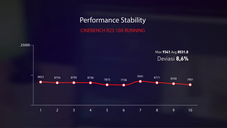 Pertama, kami melakukan pengujian stabilitas performa dari laptop ini dengan menjalankan cinebench R23 yang dijalankan selama 10x berturut-turut, di suhu ruangan 24 derajat.