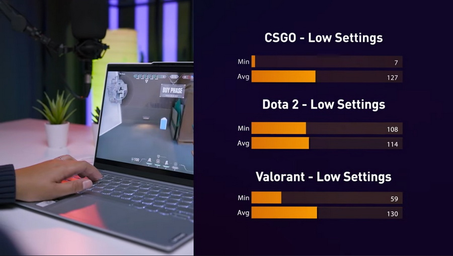 Meski hanya menggunakan Intel Iris Xe, kami tetap melakukan pengujian game pada laptop ini. Dan hasilnya laptop ini masih punya performa yang cukup bisa diandalkan untuk bermain game kompetitif seperti Valorant, CS:GO, maupun Dota 2. Dalam pengujian, tercatat kami mendapatkan fps average di atas 100-an fps. Lumayan lah untuk sekelas laptop tanpa GPU diskrit.