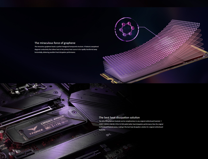 Team T-FORCE CARDEA Z540 M.2 PCIe 5.0 SSD ini dilengkapi dengan heatsink graphene ultra tipis eksklusif yang menggabungkan beberapa teknologi modern. Heatsink ini terbuat dari 100% bahan graphene yang dapat didaur ulang.