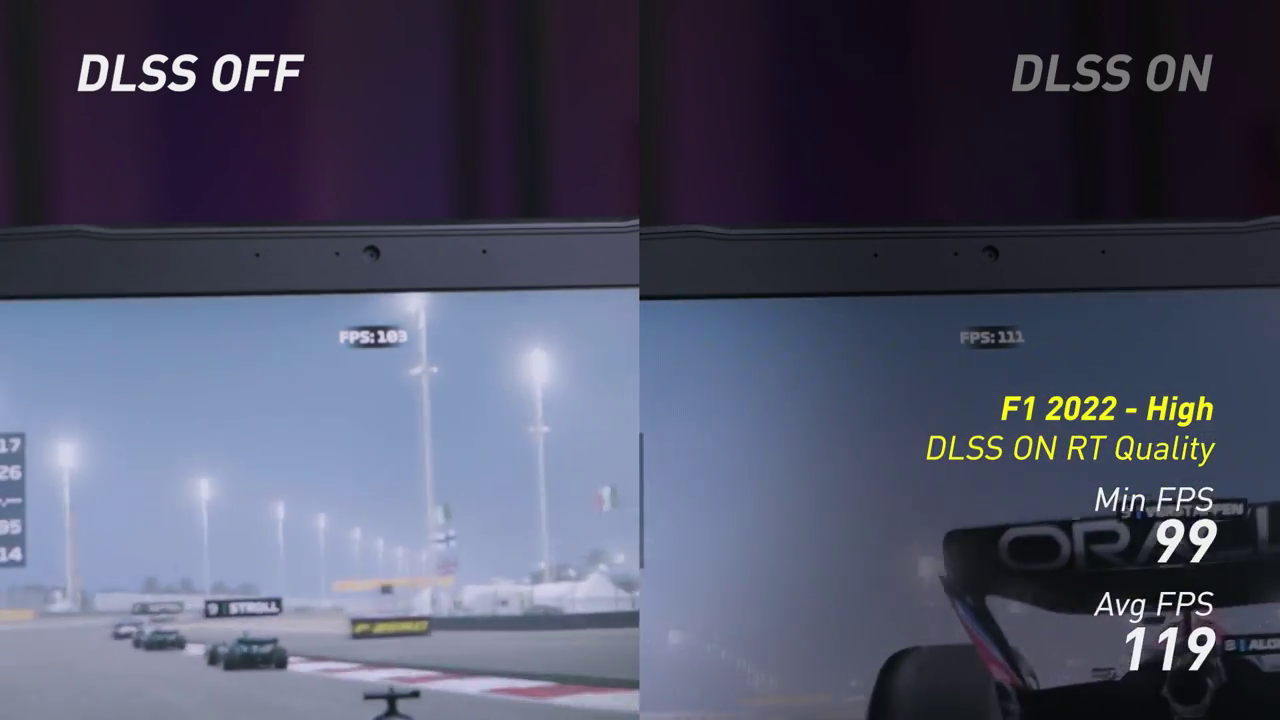 Dan karena udah pake RTX 4000, kurang rasanya kalau kita gak coba memaksimalkan GPU laptop ini untuk penggunaan DLSS 3 dalam game, disini kita pake 2 game utama untuk pengujian DLSS 3, F1 2022 dan Cyberpunk 2077.