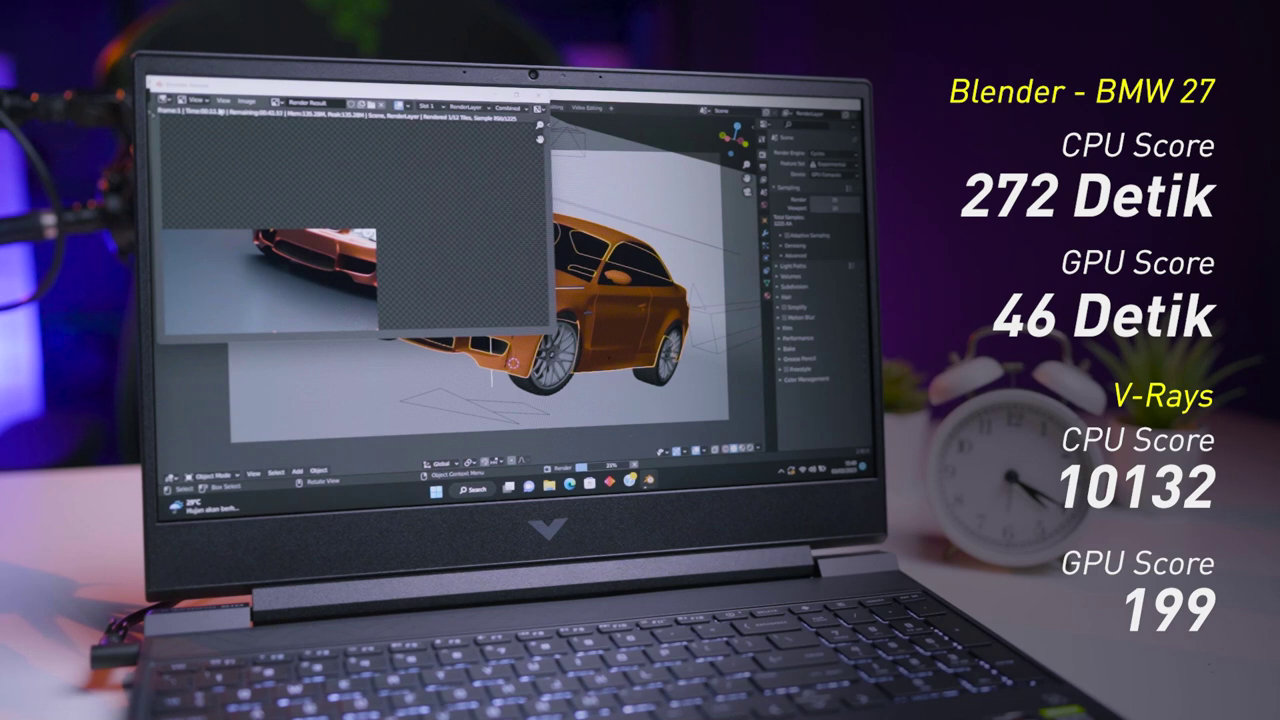 Mau dipake render? tentu bisa, kami pun lakukan pengujian Blender dengan skenario BMW 27, dan hasilnya surprisingly lumayan kenceng, kalau dibandingin sama laptop lain dengan GPU yang sama. Rendering time by GPU ada di 46 detik doang, dengan suhu yang mentok di 88 derajat celcius.