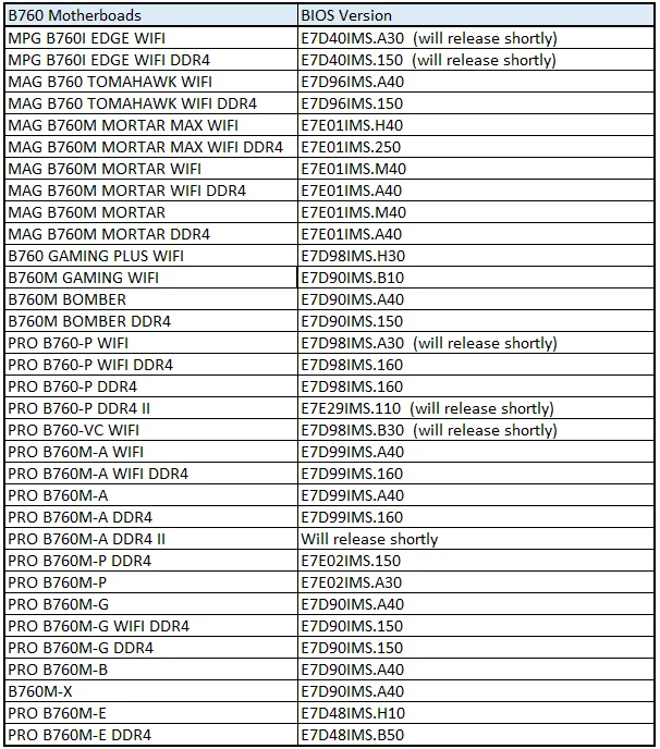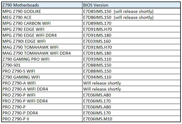 Berikut ini adalah daftar motherboard MSI yang akan menerima update BIOS: