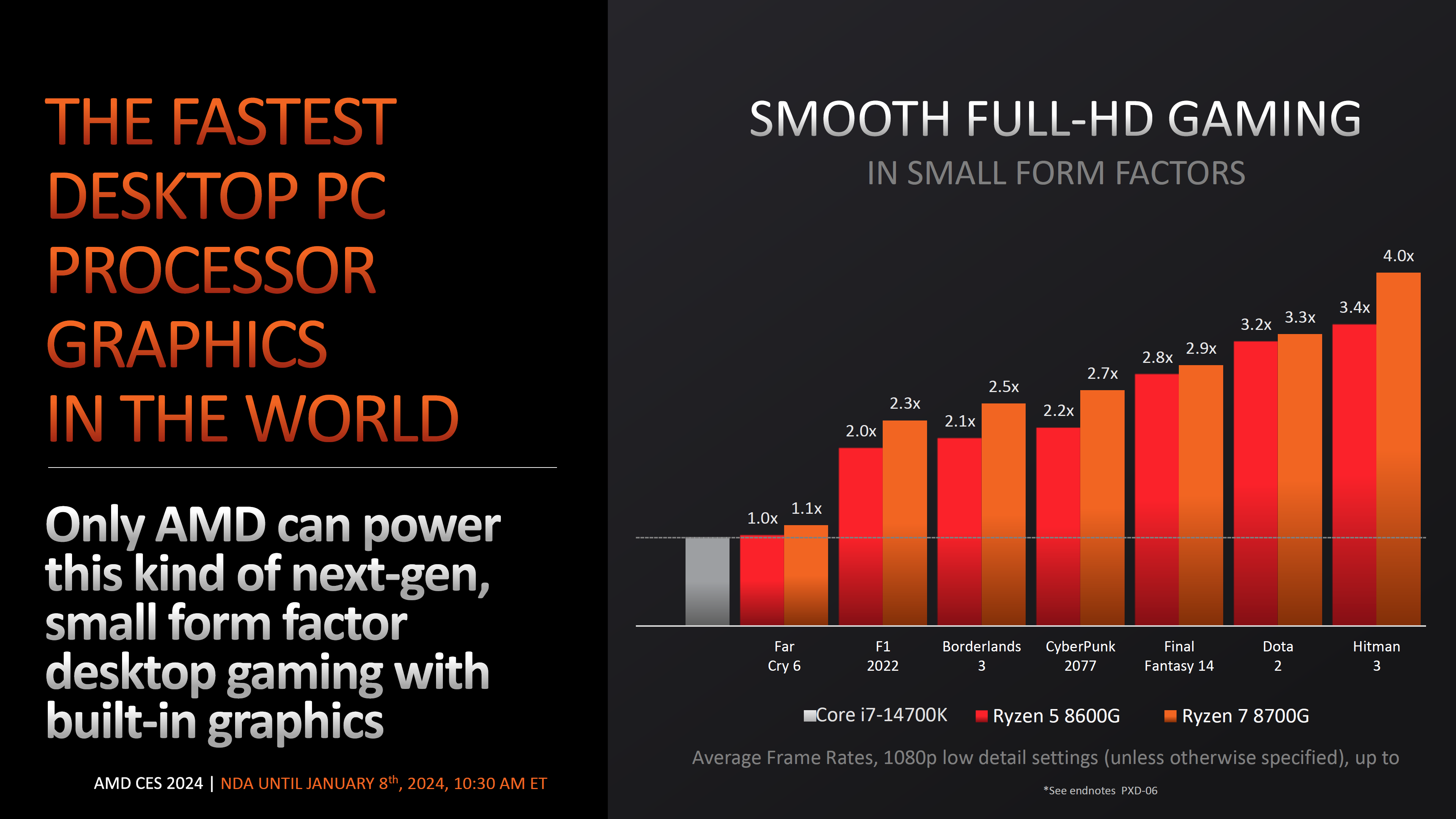 Mengenai aspek paling signifikan dari chip ini, yaitu performa gaming, AMD menggembar-gemborkan peningkatan 4x dibandingkan solusi Intel iGPU yang ditawarkan pada chip grafis UHD 770 yang ditampilkan pada CPU Desktop Generasi ke-14/13.