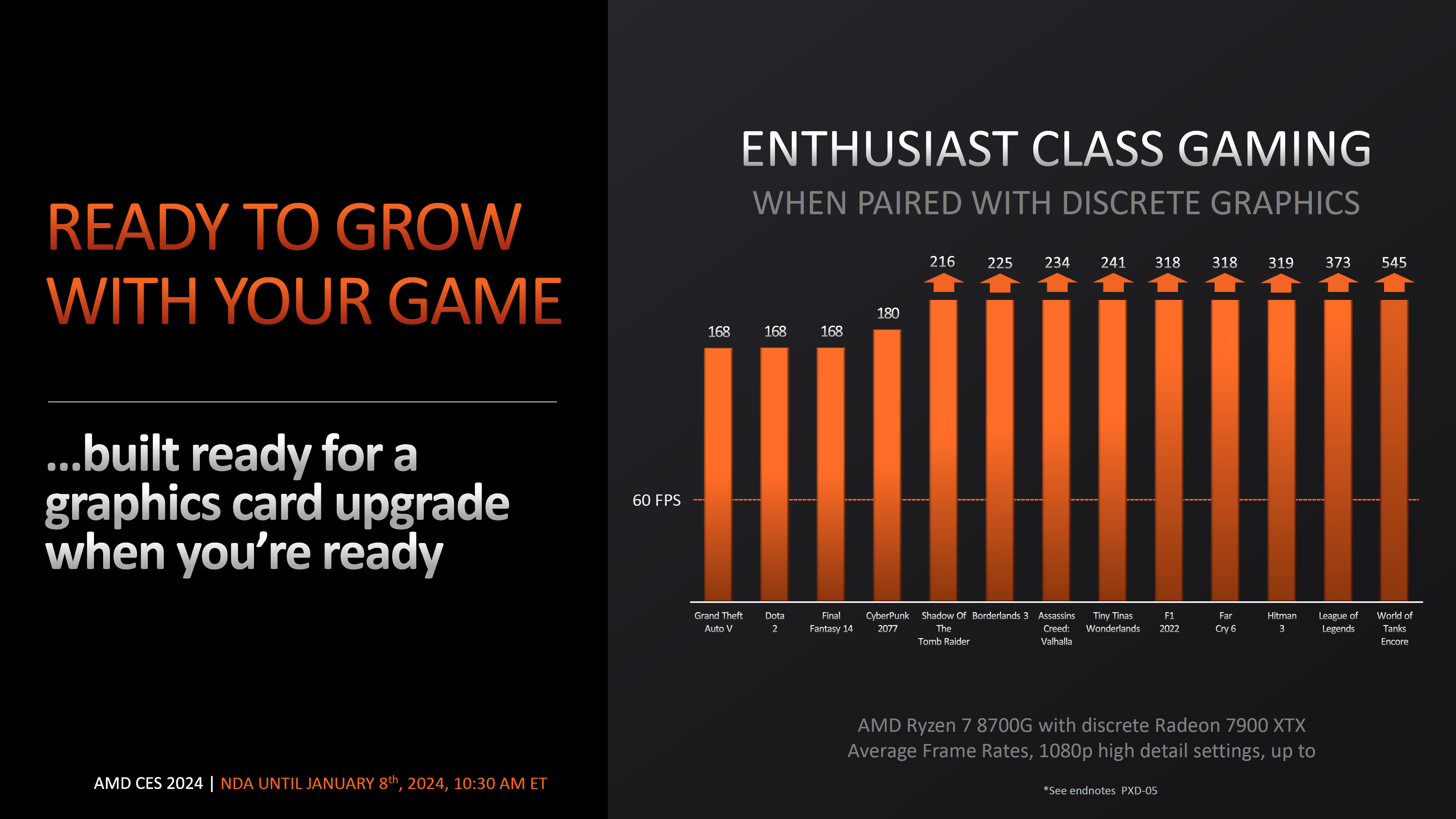 Dan bahkan ketika dipasangkan dengan kartu grafis diskrit, arsitektur inti AMD Zen 4 memberikan kinerja yang baik dibandingkan chip generasi sebelumnya. Anda dapat dengan mudah mendapatkan lebih dari 100 FPS di berbagai judul seperti yang ditunjukkan AMD dalam demonstrasinya di mana Ryzen 7 8700G berjalan bersama kartu grafis Radeon RX 7900 XTX.