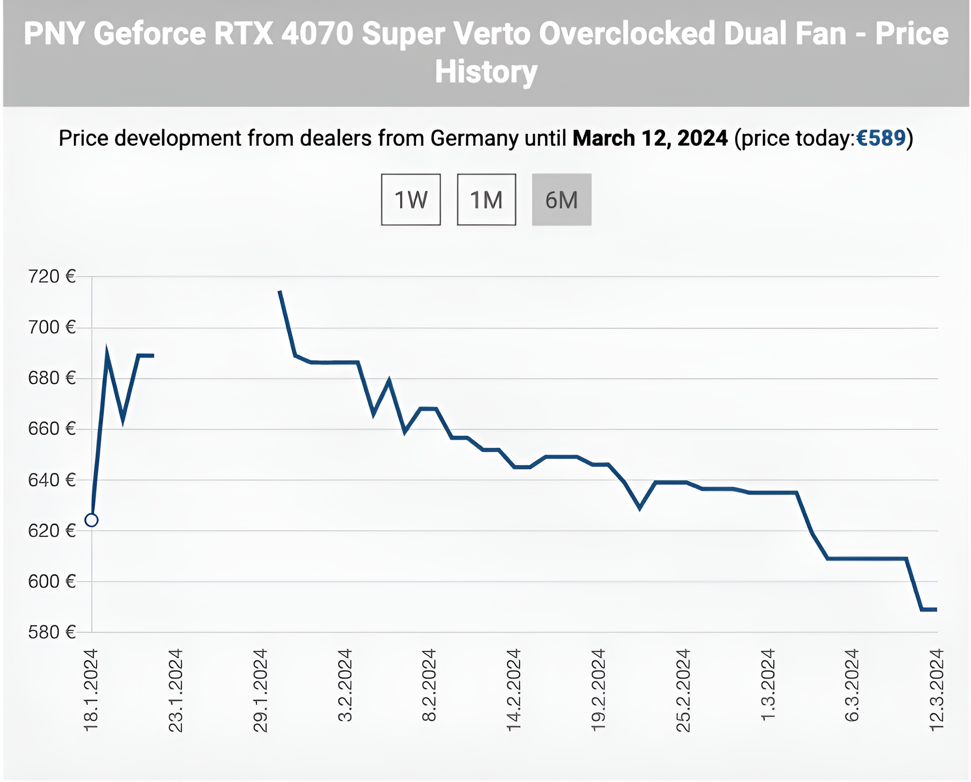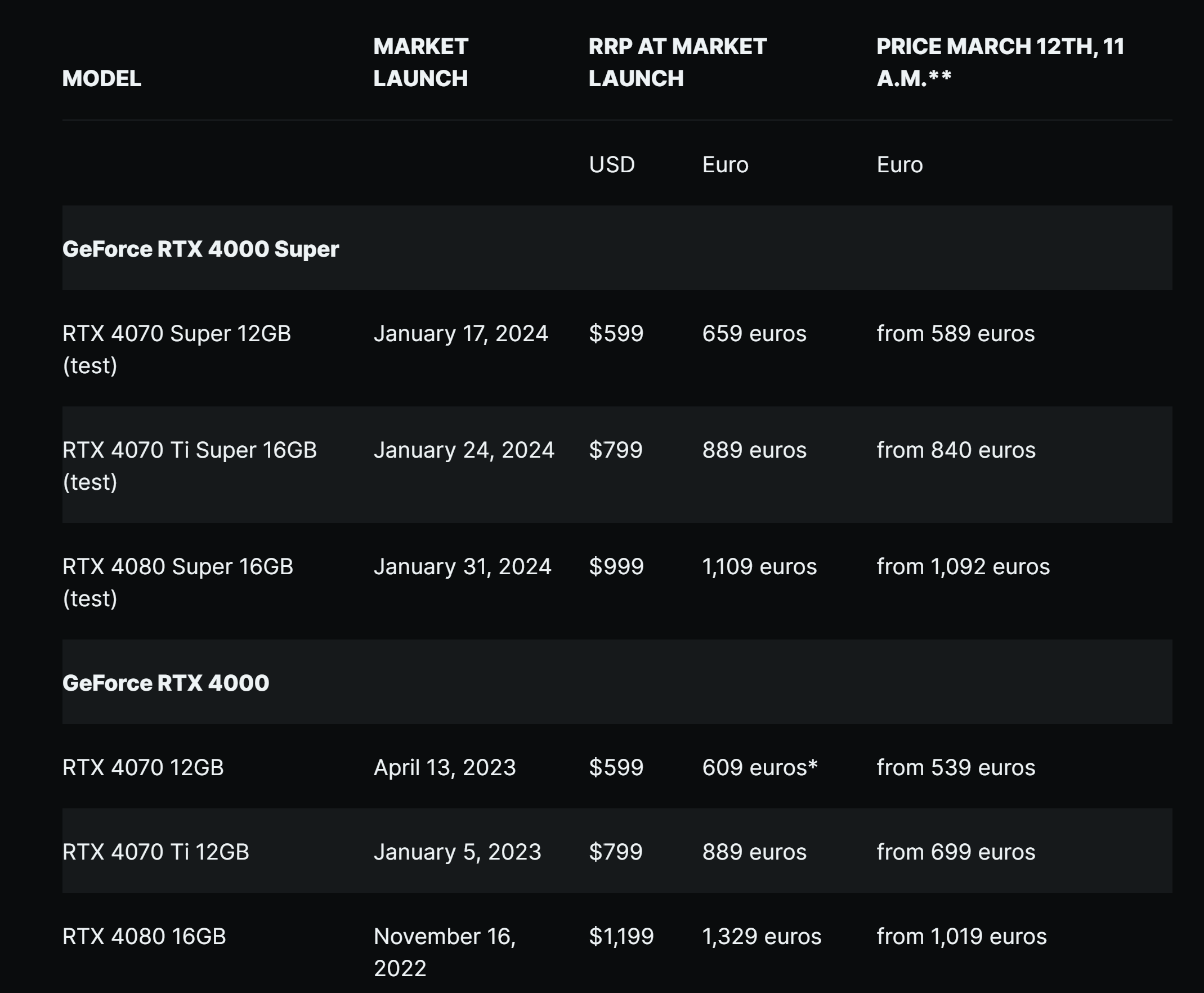 Dimulai dengan NVIDIA GeForce RTX 4070 SUPER tingkat menengah, GPU telah turun menjadi €589 setelah terdaftar seharga €659, menandai perbedaan yang cukup besar. Selain itu, RTX 4070 Ti SUPER juga mengalami pengurangan serupa, turun hampir €50 dari harga peluncuran awal.