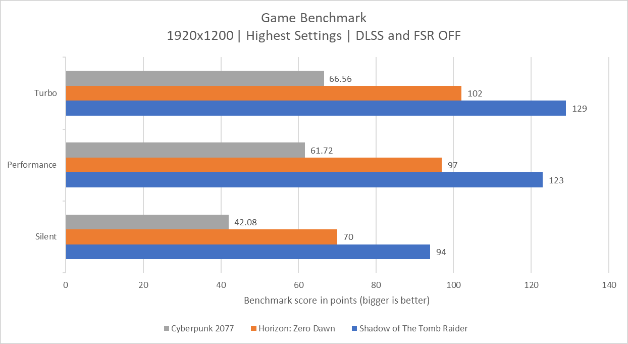 Bagaimana dengan performa gaming-nya? Tentu saja tetap kencang. Saat diuji menggunakan tiga game AAA yaitu Shadow of The Tomb Raider, Cyberpunk 2077, dan Horizon: Zero Dawn pada resolusi FHD+ (1920×1200), pengaturan garfis paling tinggi, serta tanpa bantuan DLSS atau FSR, Zephyrus G14 (GA403) yang dibekali prosesor AMD Ryzen™ 9 8945HS, GPU NVIDIA GeForce RTX 4060, dan memori 16GB, dapat menghasilkan framerate yang cukup tinggi.