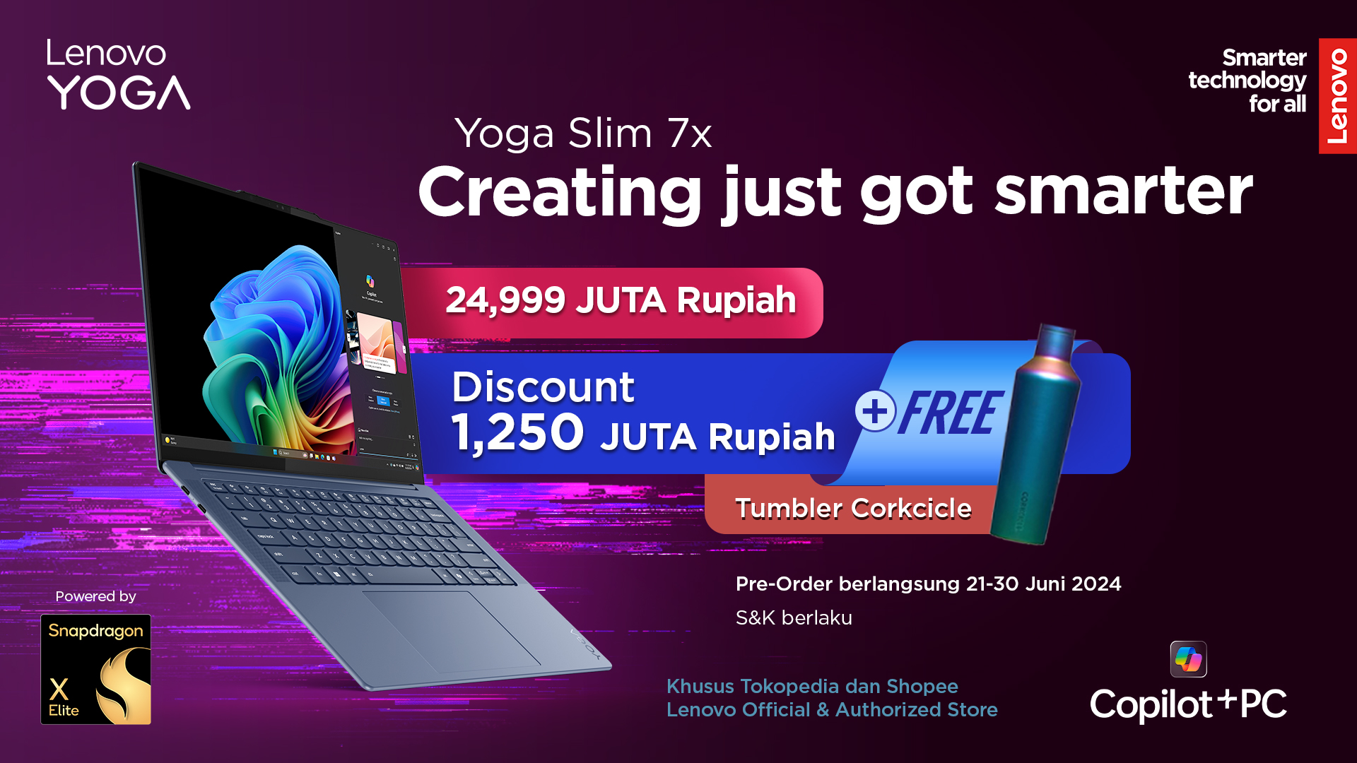 Jangan lewatkan periode pre-order generasi pertama PC Copilot+ Lenovo Yoga™ Slim 7x serta nikmati penawaran spesialnya. Untuk informasi lebih lanjut kunjungi laman media sosial dan situs resmi Lenovo Indonesia.