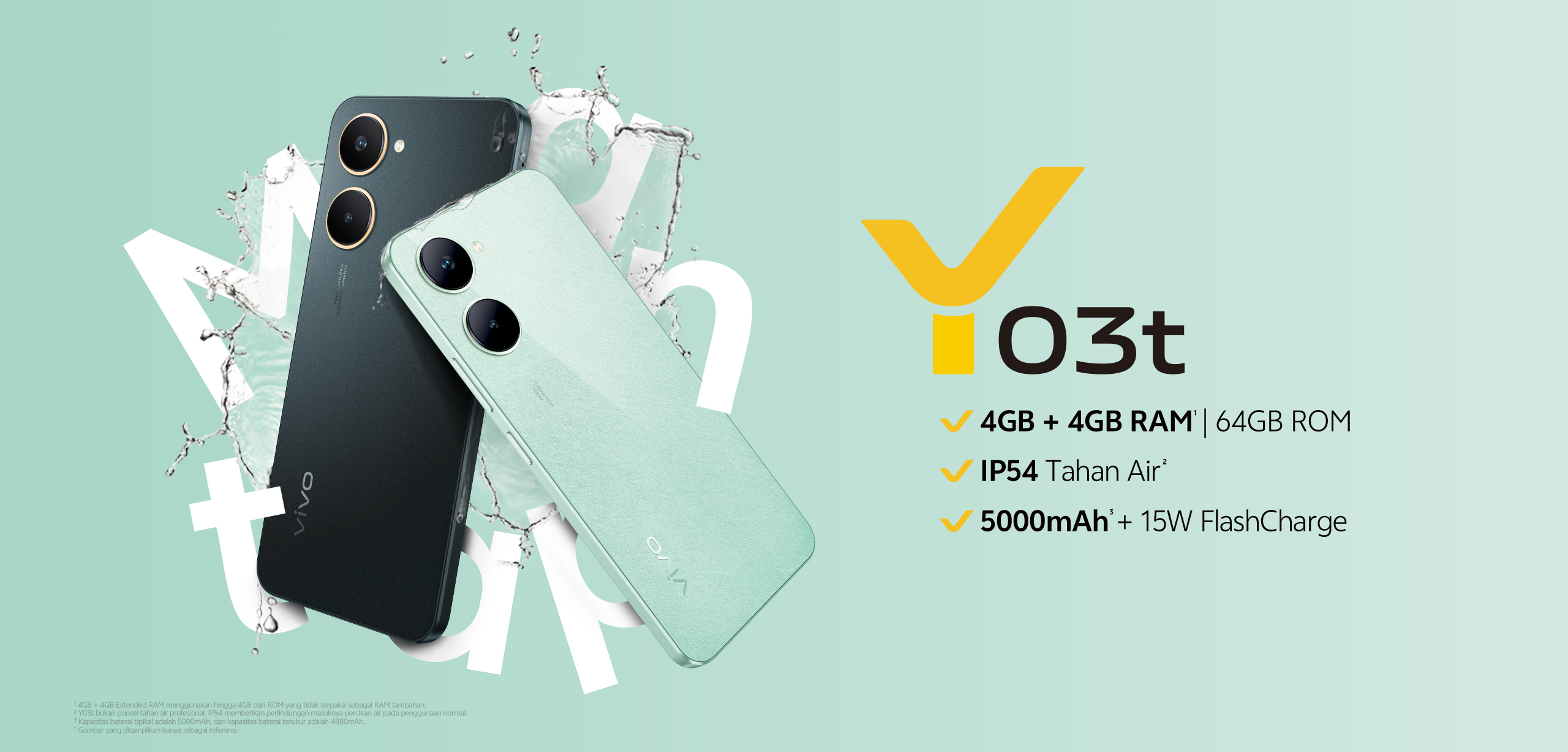 Selain fitur RAM Virtual, Vivo Y03t juga dilengkapi dengan slot microSD yang memungkinkan pengguna memperluas kapasitas penyimpanan internal hingga 1TB. Dalam hal tampilan, Vivo Y03t memiliki layar IPS LCD berukuran 6.56 inci yang menawarkan resolusi HD+ (720 x 1.612 piksel) dan mendukung refresh rate 90Hz.
