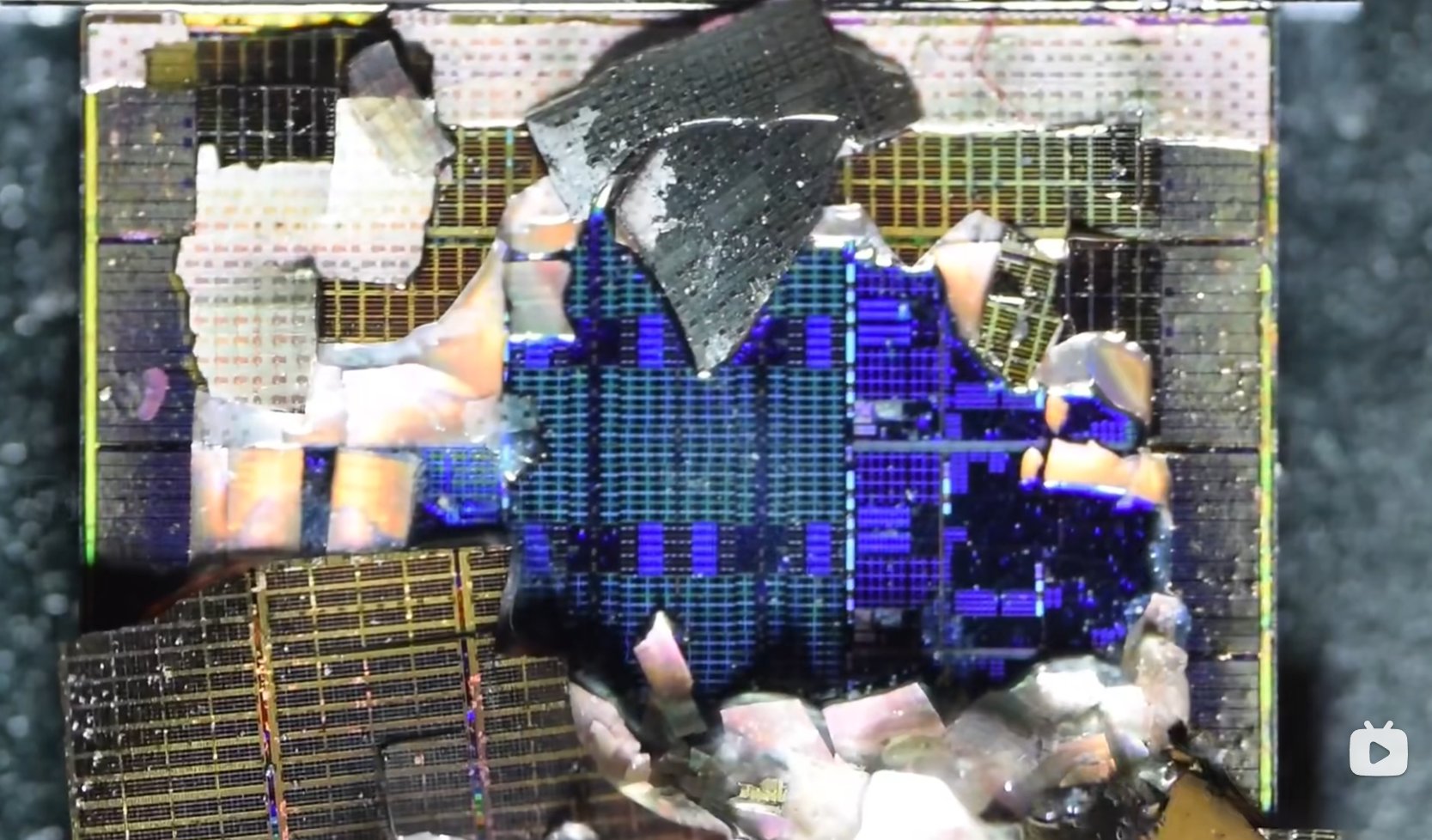 CCD ditusuk lebih jauh untuk memperlihatkan tumpukan 3D V-Cache biru mengilap yang terletak di bawah CCD kali ini untuk ryzen 9 8900X3D, sementara Ryzen memiliki tumpukan 3D V-Cache biru mengilap di atas CCD core CPU nya sehingga bisa mengganggu proses disipasi panas.