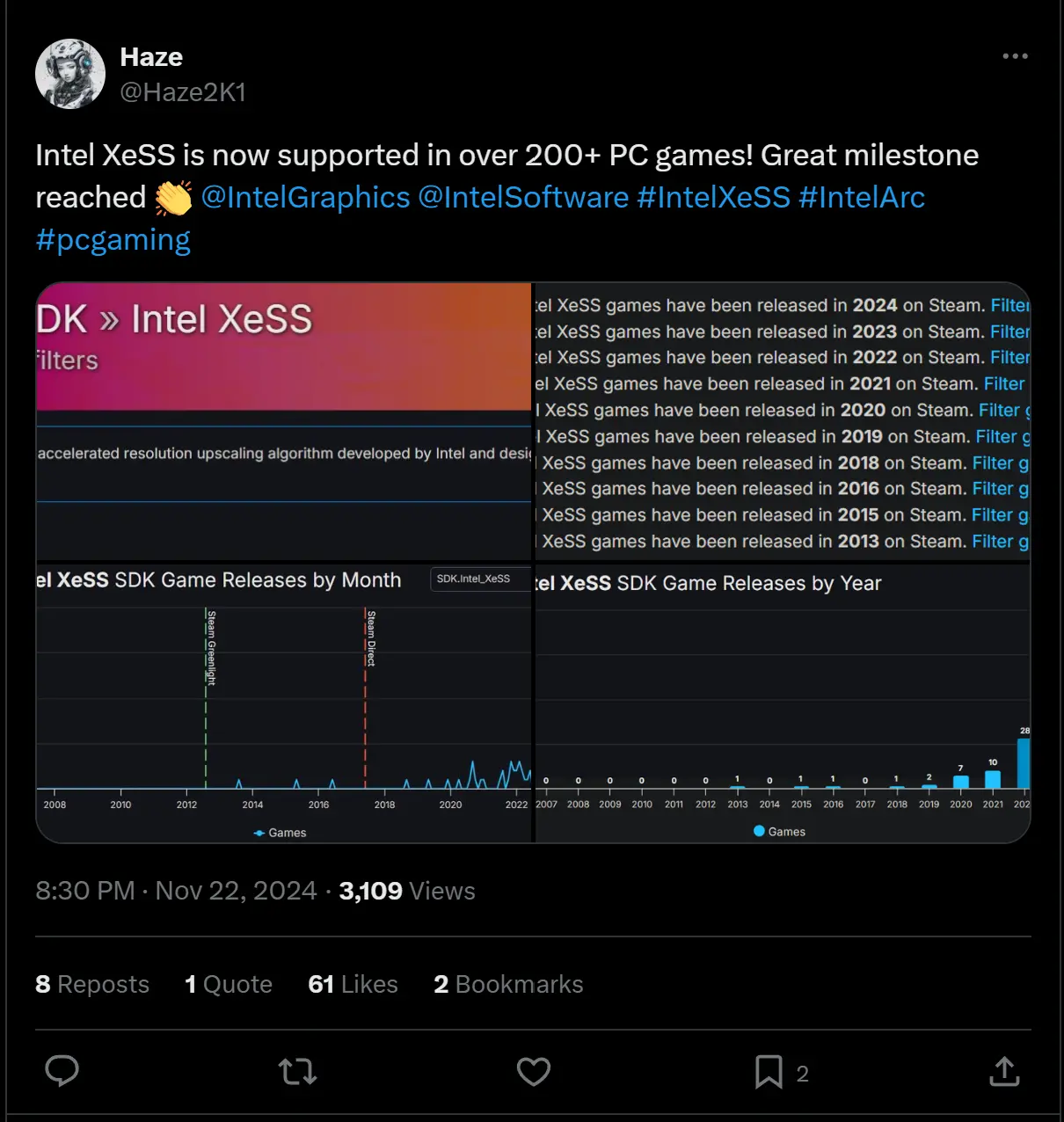 Berkat upaya Intel, teknologi XeSS telah mencapai dukungan di lebih dari dua ratus judul game dari apa yang diungkap @Haze2K1 dalam akun X nya. Dukungan yang meningkat untuk Intel XeSS tentu menggambarkan minat konsumen maupun developer game terhadap teknologi tersebut, serta kecenderungan pengembang game untuk menyediakan dukungan untuk XeSS Intel dalam proyek mereka masing-masing.