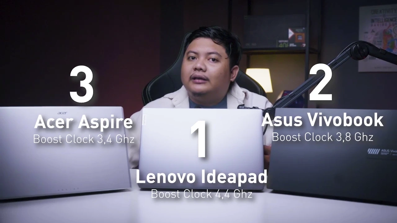 Masuk ke pengujian Benchmark CPU yang secara teori kalau kita ukut dari boost clock peringkatnya seperti ini. Lenovo Ideapad Slim 3i nomor 1 dengan 4.4 GHz boost clock, nomor 2 ASUS Vivobook dengan 3.8 GHz dan Acer Aspire 3.4 GHz boost clock.