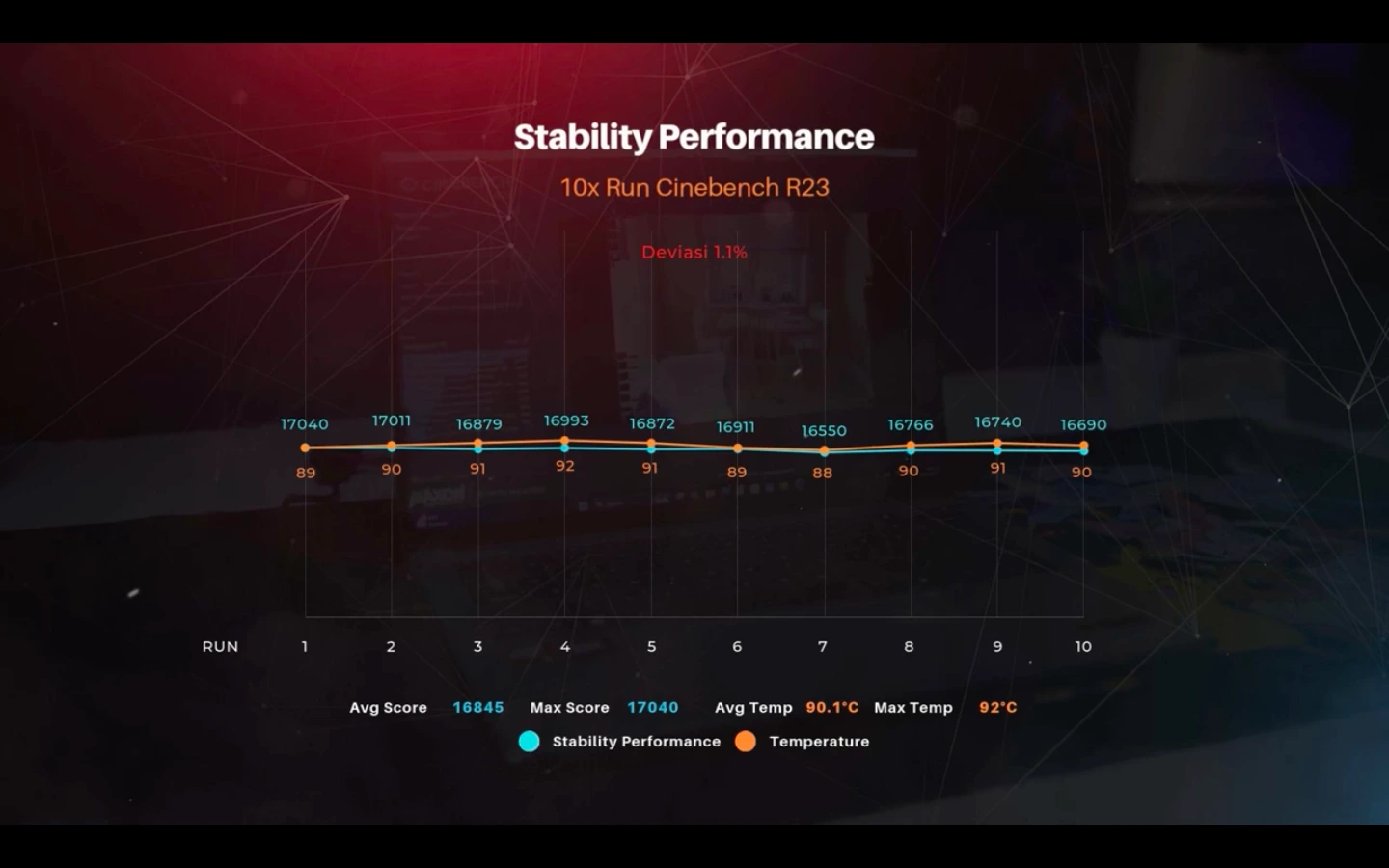 Masuk kebagian performa CPU, pertama Kita bahas laptop ini dari sisi creations yakni Cinebench R23. Laptop ini memiliki performa rata-rata di sekitar 17 ribu point dengan deviasi performa yang relatif stabil tapi dengan catatan suhunya di beberapa titik cukup tinggi sekitar 91 – 92 derajat celcius, meskipun sisi lain sebenarnya masih dalam range yang aman karena TJmax prosesor laptop ini ada di angka 100 derajat celcius.