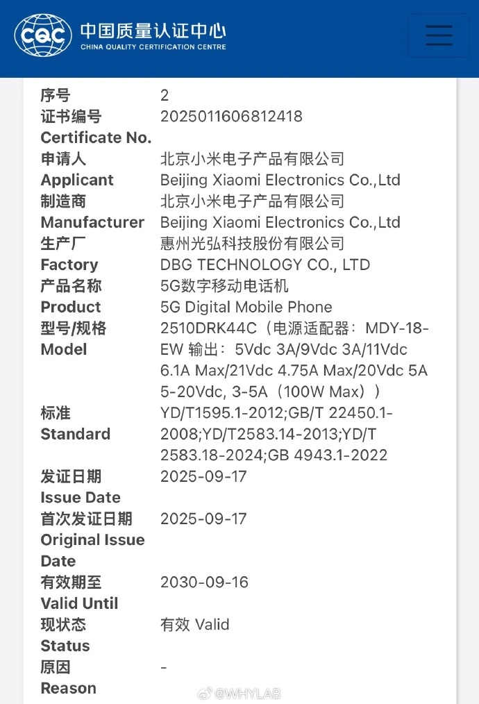 Dokumen sertifikasi 3C untuk ponsel Xiaomi dengan nomor model 2510DRK44C, menunjukkan dukungan pengisian daya maksimal 100W.
