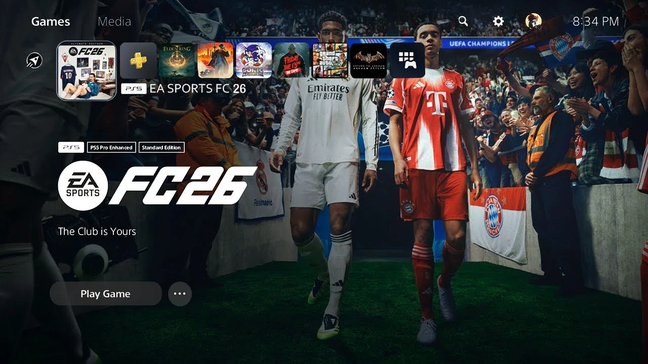Tampilan menu utama game EA FC 26 di dasbor konsol, mengilustrasikan game yang kini bisa dimainkan lewat early access EA FC 26.