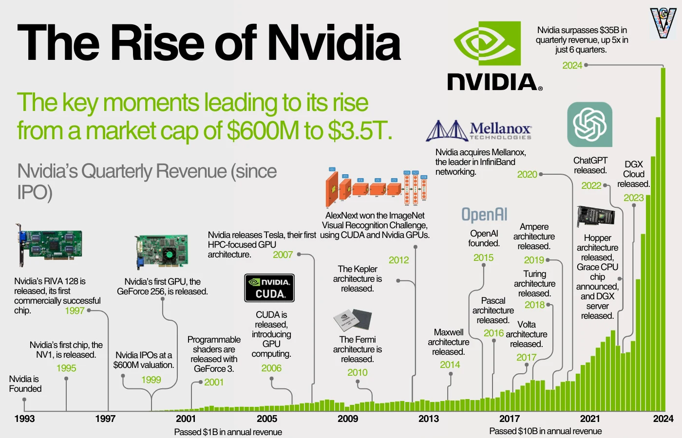 Siapa sangka perusahaan yang identik dengan kartu grafis (VGA) untuk para gamer kini menjadi perusahaan publik paling bernilai di dunia, dengan valuasi menembus 4 TRILIUN DOLAR? Angka ini bahkan berhasil melampaui raksasa teknologi seperti Apple dan Microsoft. Dalam sejarah NVIDIA, transformasi ini adalah salah satu yang paling fenomenal di dunia teknologi, di mana nilainya meroket 10 kali lipat hanya dalam dua tahun terakhir. Lantas, bagaimana mereka bisa mencapai puncak ini?