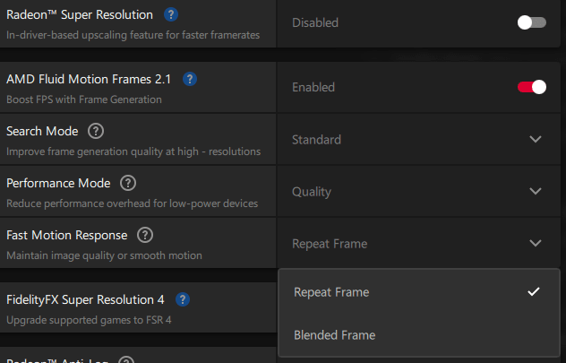 Opsi “Fast Motion Response” akan muncul di bawah pengaturan AFMF 2.1, memberikan pilihan antara “Repeat Frame” dan “Blended Frame”.