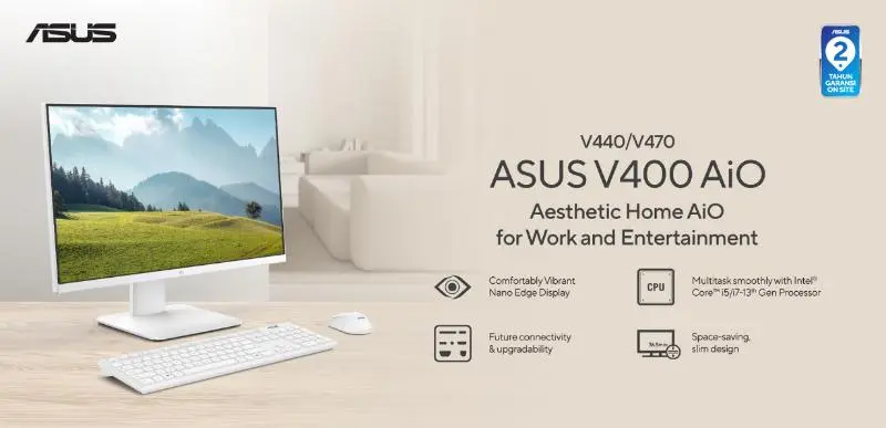 ASUS V440 hadir sebagai All-in-One PC yang menggabungkan estetika minimalis dengan performa tinggi untuk produktivitas modern.