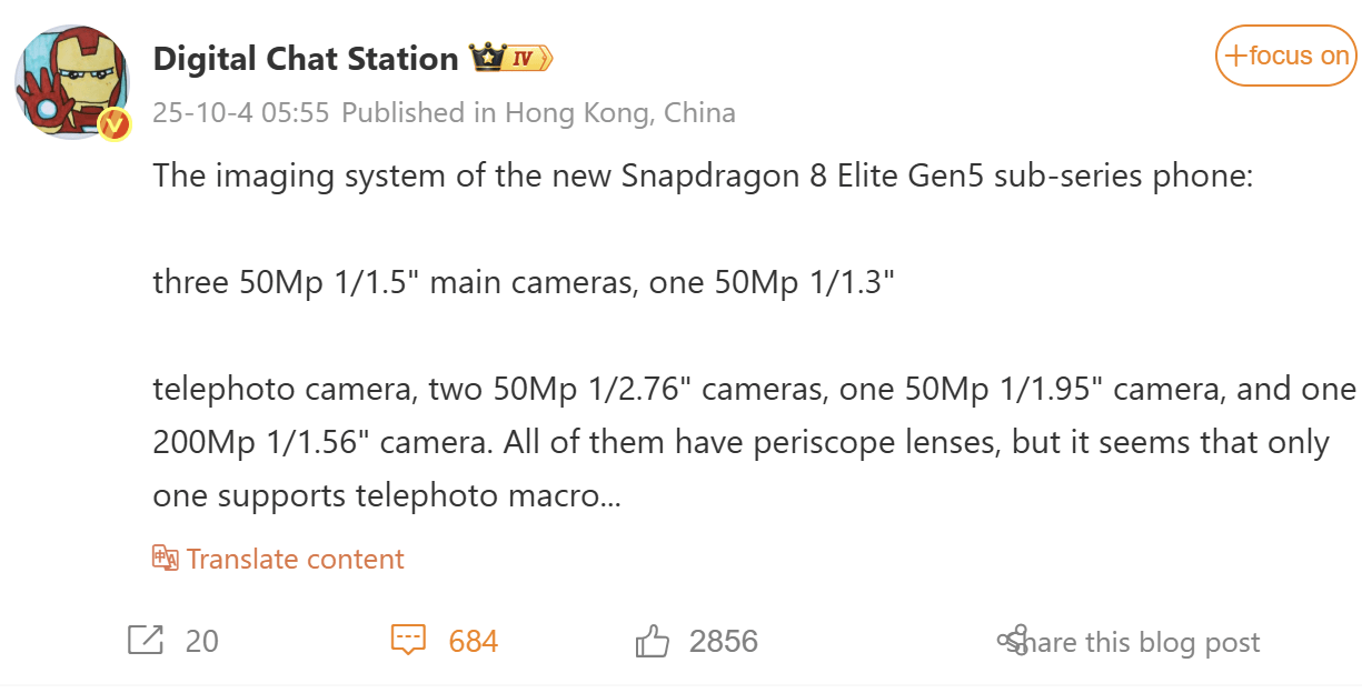 Bocoran dari Weibo mengonfirmasi bahwa semua ponsel sub-series Snapdragon 8 Elite Gen 5 akan memiliki lensa periskop.