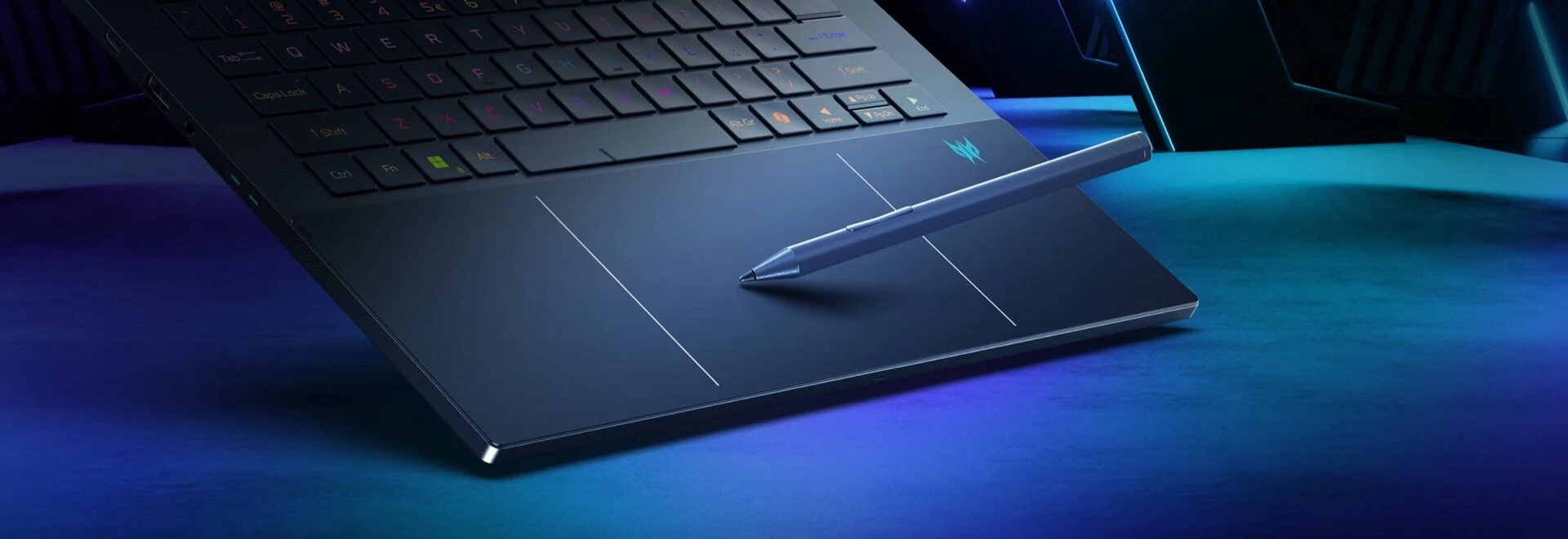 Tampilan close-up haptic trackpad pada laptop Acer Predator Triton 14 AI, dengan sebuah stylus diletakkan di atasnya untuk menunjukkan dukungan input pena.