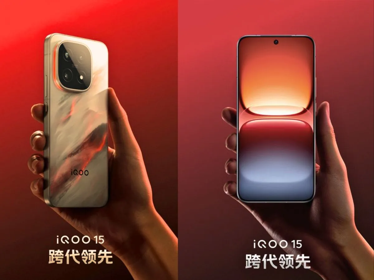 Poster resmi iQOO 15 yang menampilkan desain depan dengan layar penuh dan desain belakang dengan modul kamera dan corak unik.