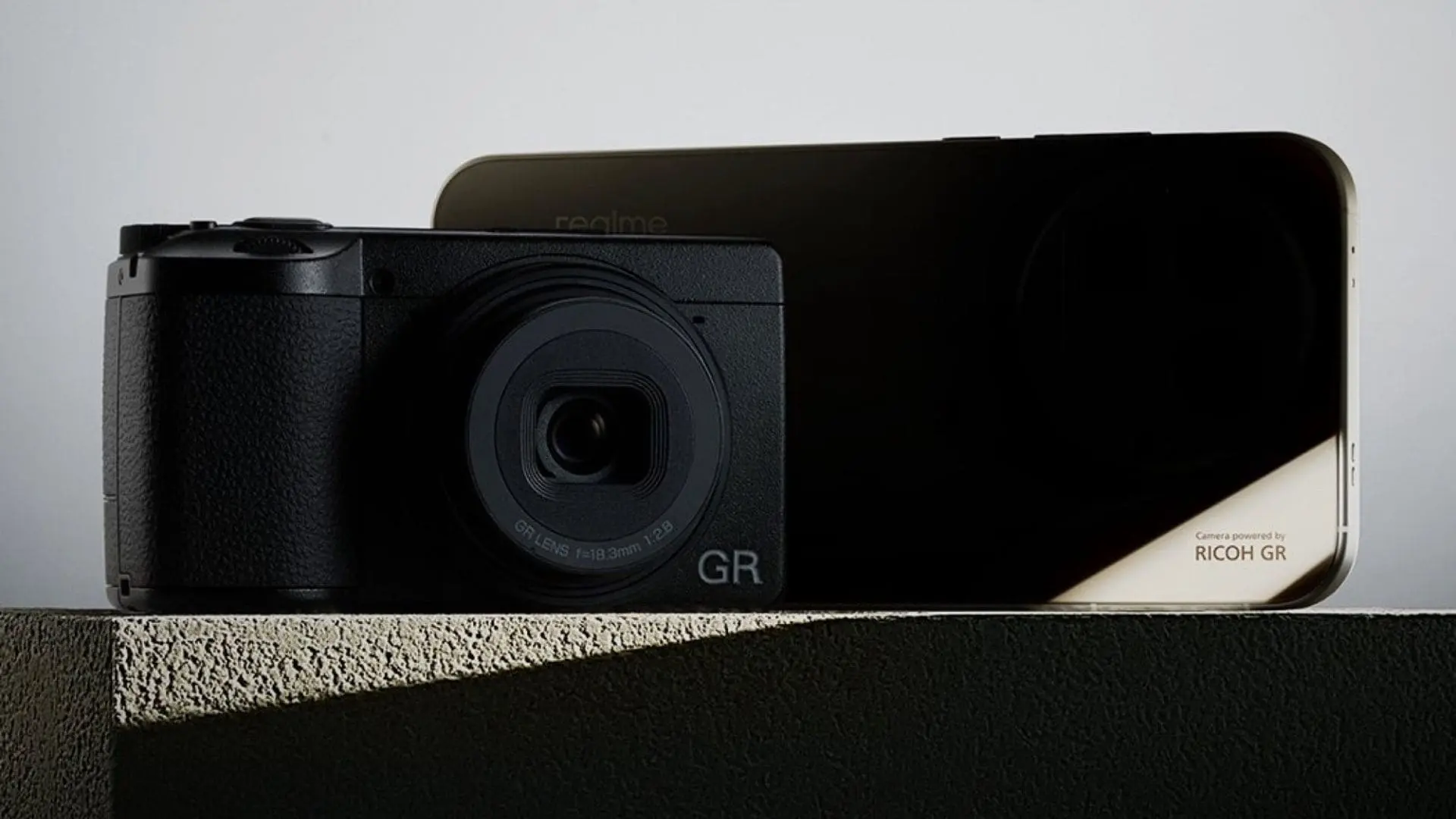 Kamera Ricoh GR diletakkan di depan smartphone Realme, sebagai ilustrasi kemitraan yang membawa fitur kamera khas Ricoh ke Realme GT 8 Pro.