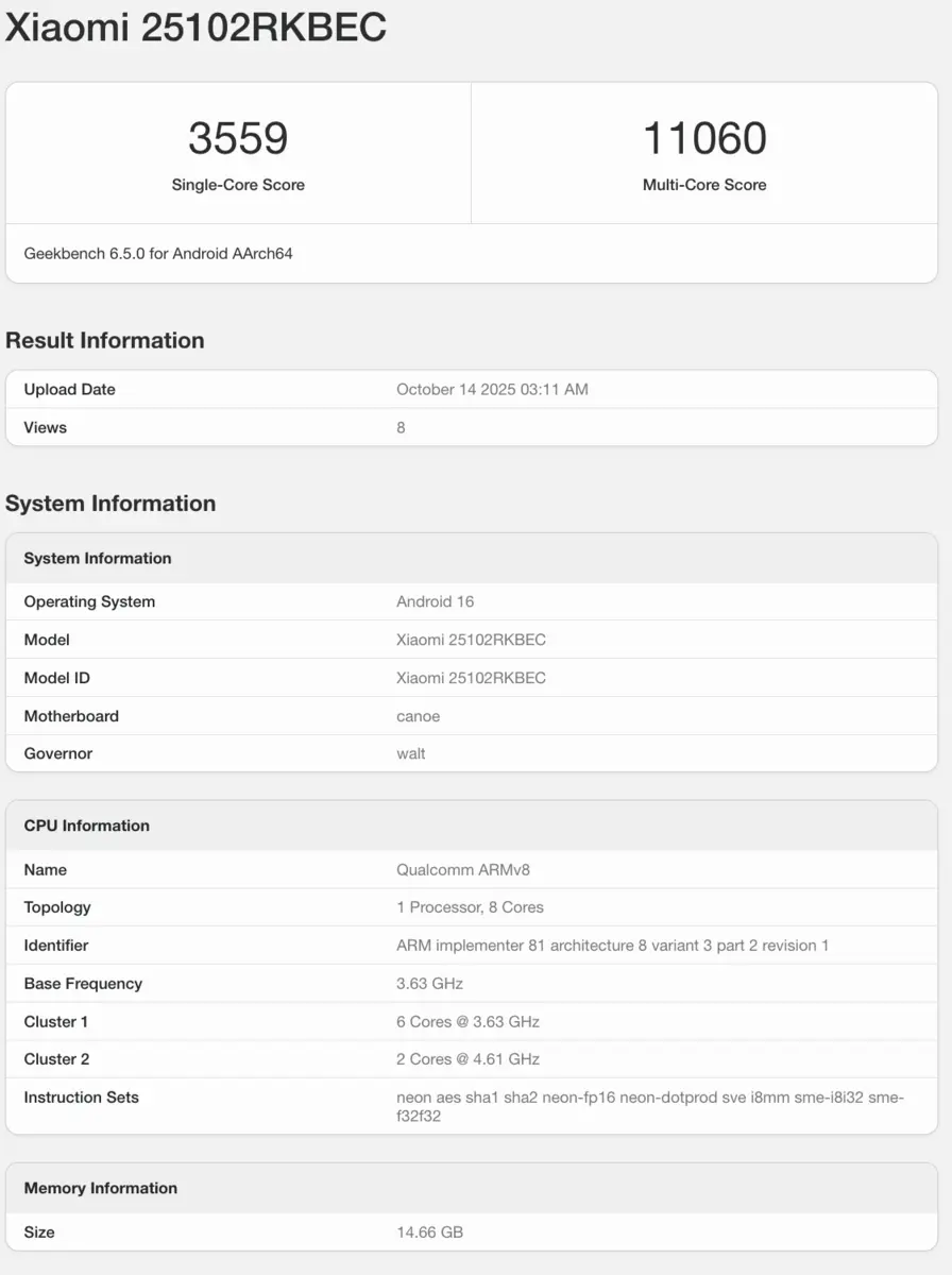 Perangkat dengan nomor model “25102RKBEC” ini muncul di Geekbench dengan spesifikasi yang sangat mengesankan. Ditenagai oleh Snapdragon 8 Elite Gen 5 dan RAM sebesar 16GB, serta sudah menjalankan Android 16, calon Poco F8 Ultra ini berhasil mencetak skor yang luar biasa: