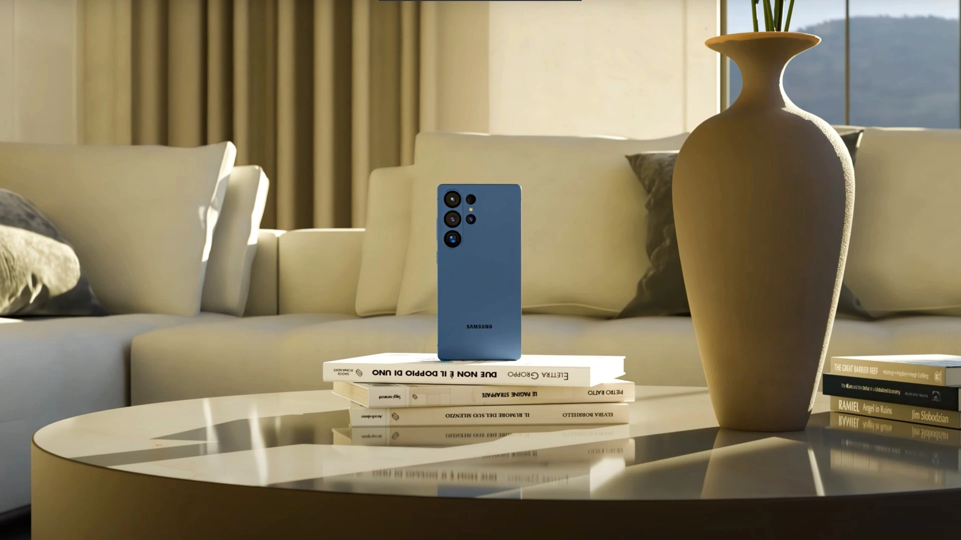 Samsung Galaxy S26 Ultra biru di meja kopi dengan sofa dan vas, mengilustrasikan rumor penundaan peluncuran