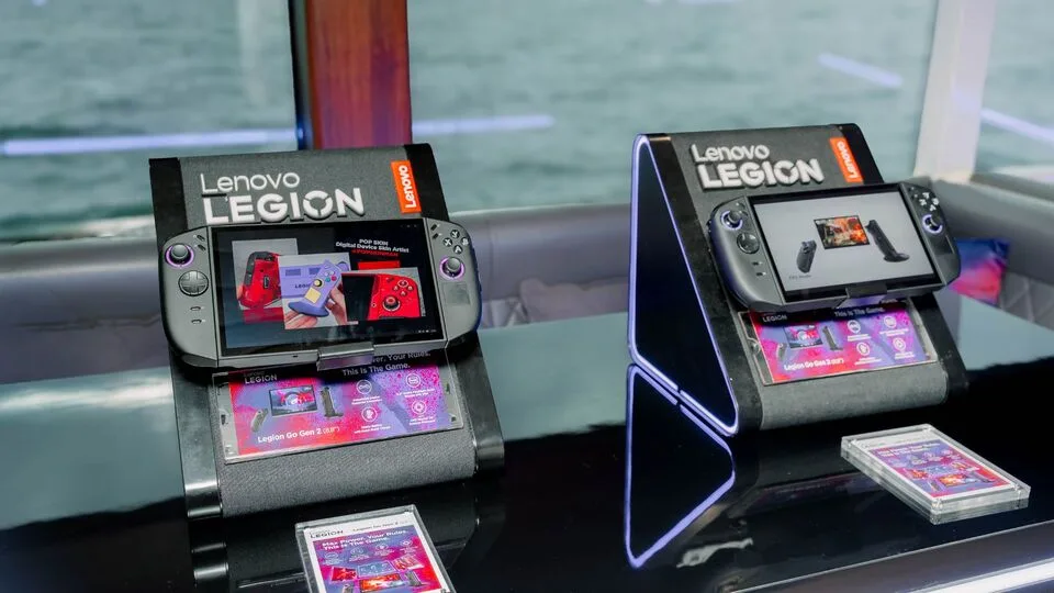 Dua unit Lenovo Legion Go 2 dipajang, menyoroti kecerahan layar PureSight OLED 144Hz dan controller TrueStrike yang dapat dilepas untuk mode FPS.