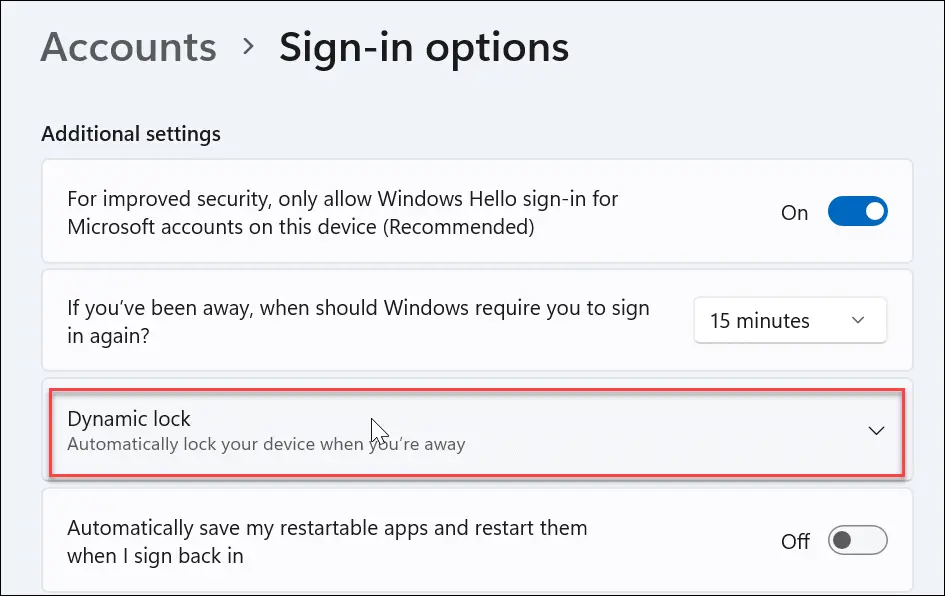 Lokasi pengaturan Dynamic Lock di Windows 11, Anda bisa menemukannya di menu Accounts > Sign-in Options.