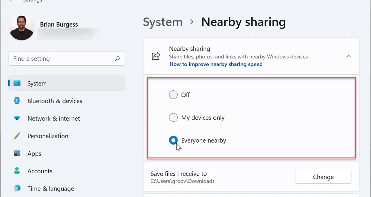 Menu pengaturan Nearby Sharing di Windows 11. Fitur tersembunyi ini memungkinkan transfer file instan ke perangkat di sekitar.