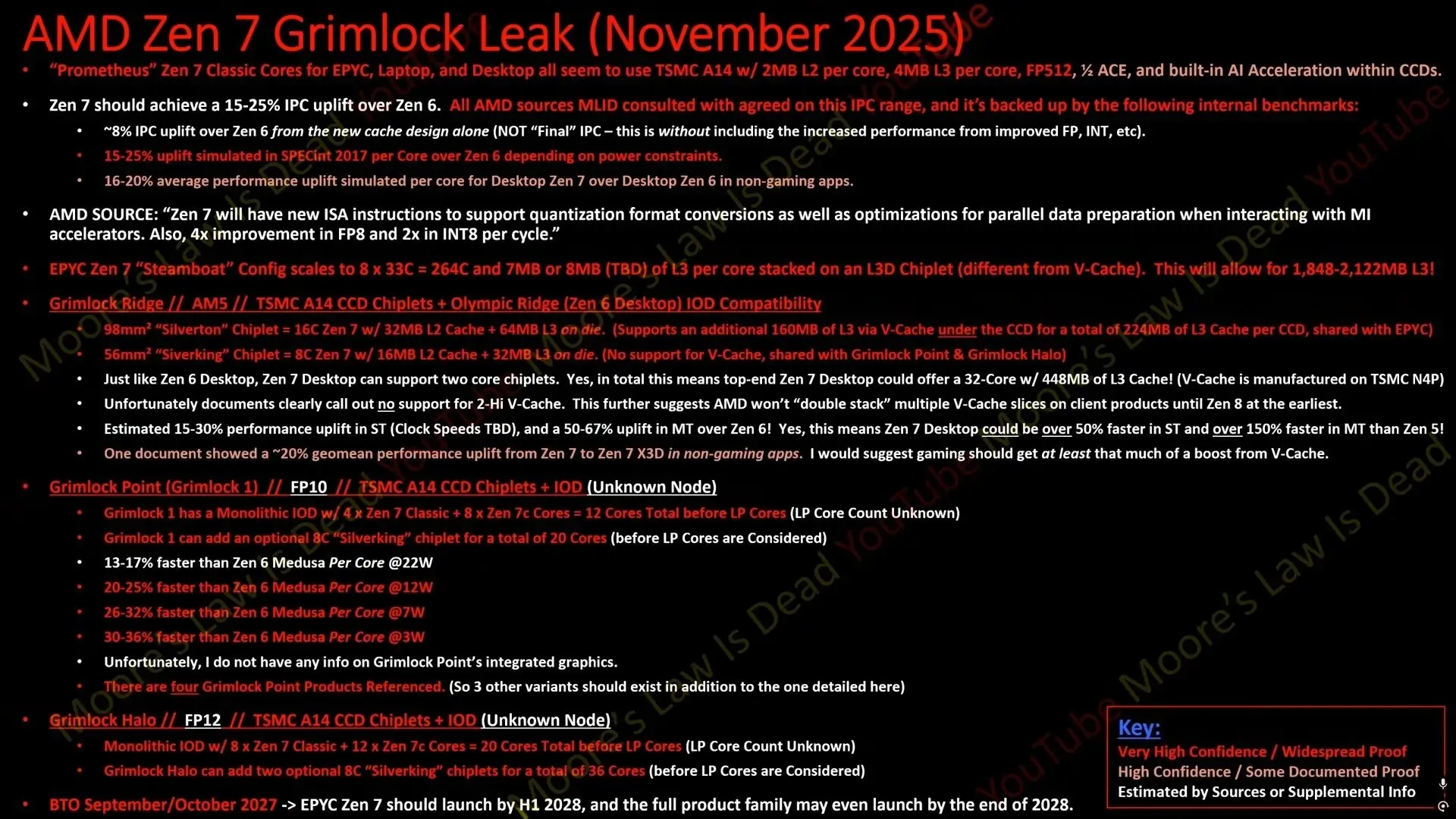 Slide bocoran spesifikasi APU AMD Zen 7 Halo Grimlock dari Moore's Law Is Dead yang menampilkan detail arsitektur TSMC A14 dan estimasi peningkatan performa IPC 15-25% dibanding Zen 6.
