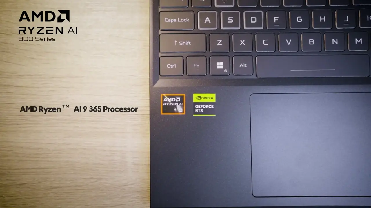 Close-up stiker prosesor AMD Ryzen AI 9 365 dan GPU NVIDIA GeForce RTX 5070 pada palm rest laptop gaming Acer Nitro 16S AI, menunjukkan dukungan NPU untuk AI lokal.