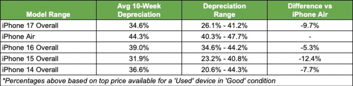 Tabel statistik depresiasi yang menunjukkan iPhone Air turun harga paling drastis hingga 47,7% dibandingkan model iPhone 17 lainnya dalam 10 minggu pertama.