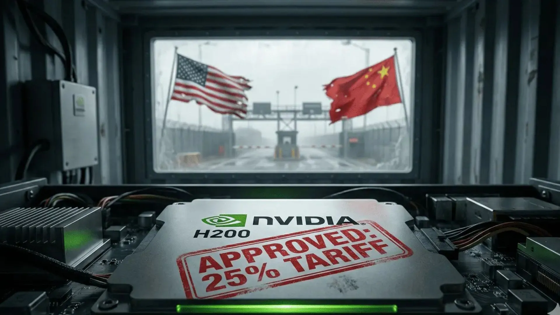 Ilustrasi chip Nvidia H200 dengan stempel merah bertuliskan "APPROVED: 25% TARIFF" di dalam kontainer, berlatar belakang bendera Amerika Serikat dan China di gerbang perbatasan.