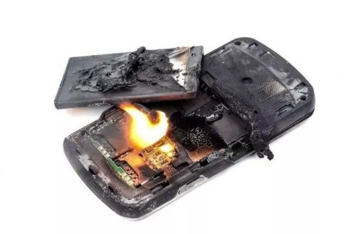 Ilustrasi atau dokumentasi baterai smartphone yang mengeluarkan api dari dalam komponen internal akibat korsleting atau thermal runaway.